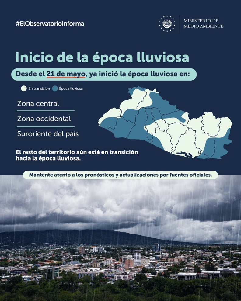 De acuerdo con el informe oficial, desde el pasado 21 de mayo se ha registrado el inicio del invierno en la parte norte del departamento de Santa Ana, la zona sureste de Ahuachapán, Sonsonate, La Libertad, así como en el norte y sur de San Salvador. También se ha establecido la época lluviosa en el norte de Cuscatlán, el centro y este de Chalatenango, el oeste de Cabañas y el sur de San Miguel y La Unión.