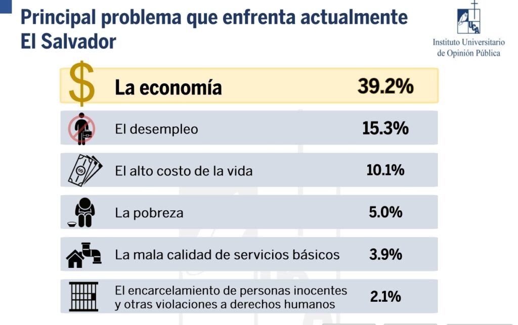 Además, la encuesta mostró que un 32% de los salvadoreños cree que la situación económica de su hogar ha empeorado durante el último año, mientras que solo un 15% opina que ha mejorado. Este dato refuerza la percepción creciente de que el área económica representa uno de los mayores retos para la actual administración.