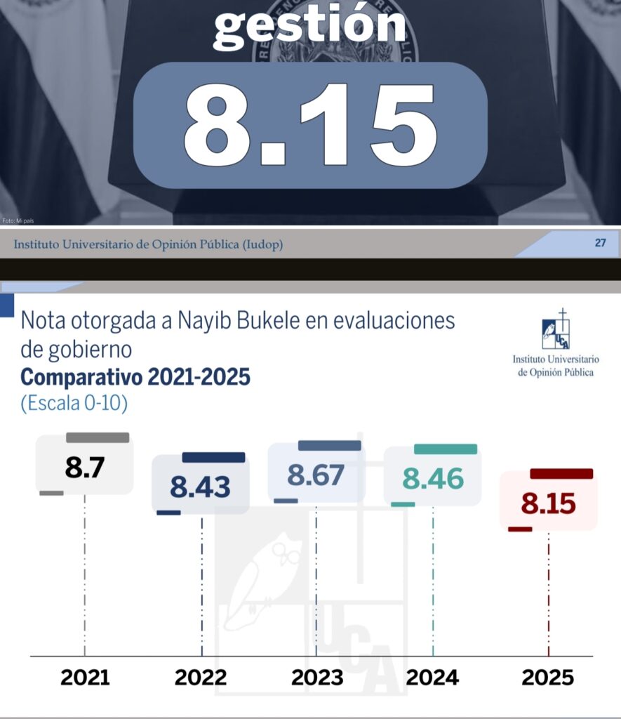 La encuesta nacional, realizada entre el 25 de mayo y el 3 de junio de 2025, asignó al presidente Bukele una calificación promedio de 8.15 sobre 10, lo que representa una ligera disminución de tres décimas en comparación con el 2024, cuando obtuvo un 8.48. Esta calificación se mantiene, sin embargo, en un rango alto, reflejando que una amplia mayoría de los ciudadanos aún aprueba el desempeño del jefe de Estado, especialmente en áreas relacionadas con seguridad.