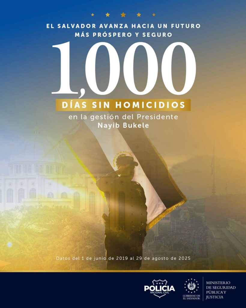 (ENNews)—El Salvador alcanzó un logro sin precedentes en su historia reciente: 1,000 días consecutivos sin homicidios. Este hecho, que parecía imposible hace apenas unos años, ha sido celebrado por funcionarios del gobierno y líderes de seguridad como una aparente muestra de que la paz y la seguridad son posibles cuando hay voluntad política, liderazgo firme y compromiso con la ciudadanía, aseguran voceros gubernamentales.