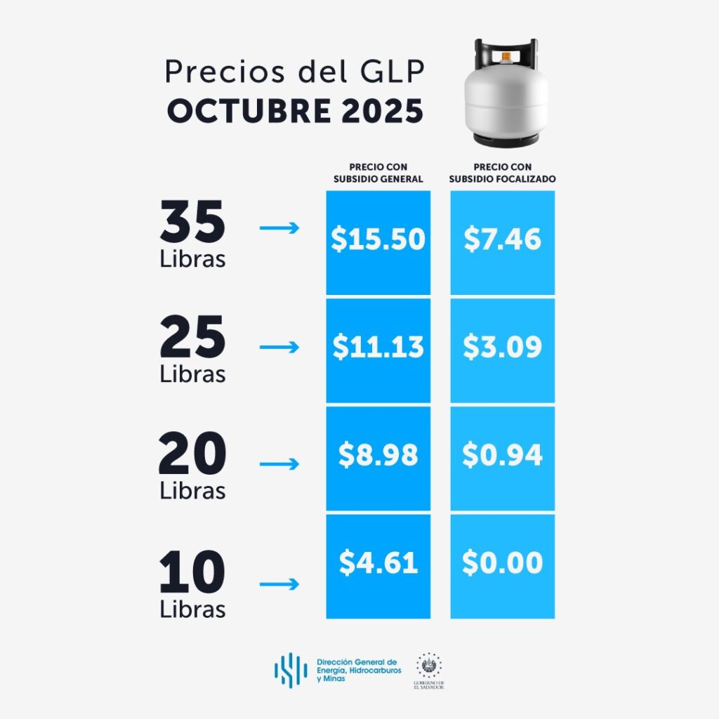 (ENNews)–La Dirección General de Energía, Hidrocarburos y Minas (DGEHM), informó que los precios de referencia del gas licuado de petróleo (GLP) en El Salvador registran un aumento en octubre de 2025, tras la reducción aplicada en septiembre. Pese al alza internacional, el impacto al consumidor final se mantiene limitado gracias a los esquemas de subsidio que el Gobierno mantiene vigentes.